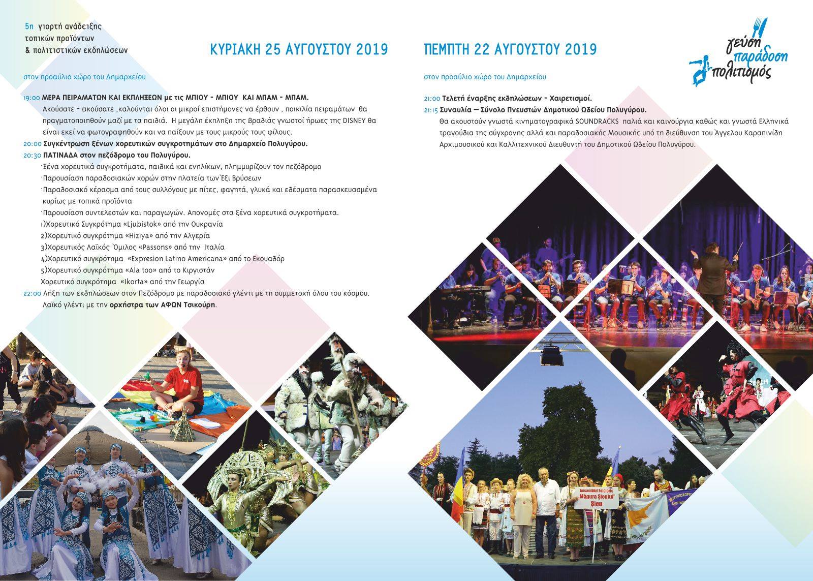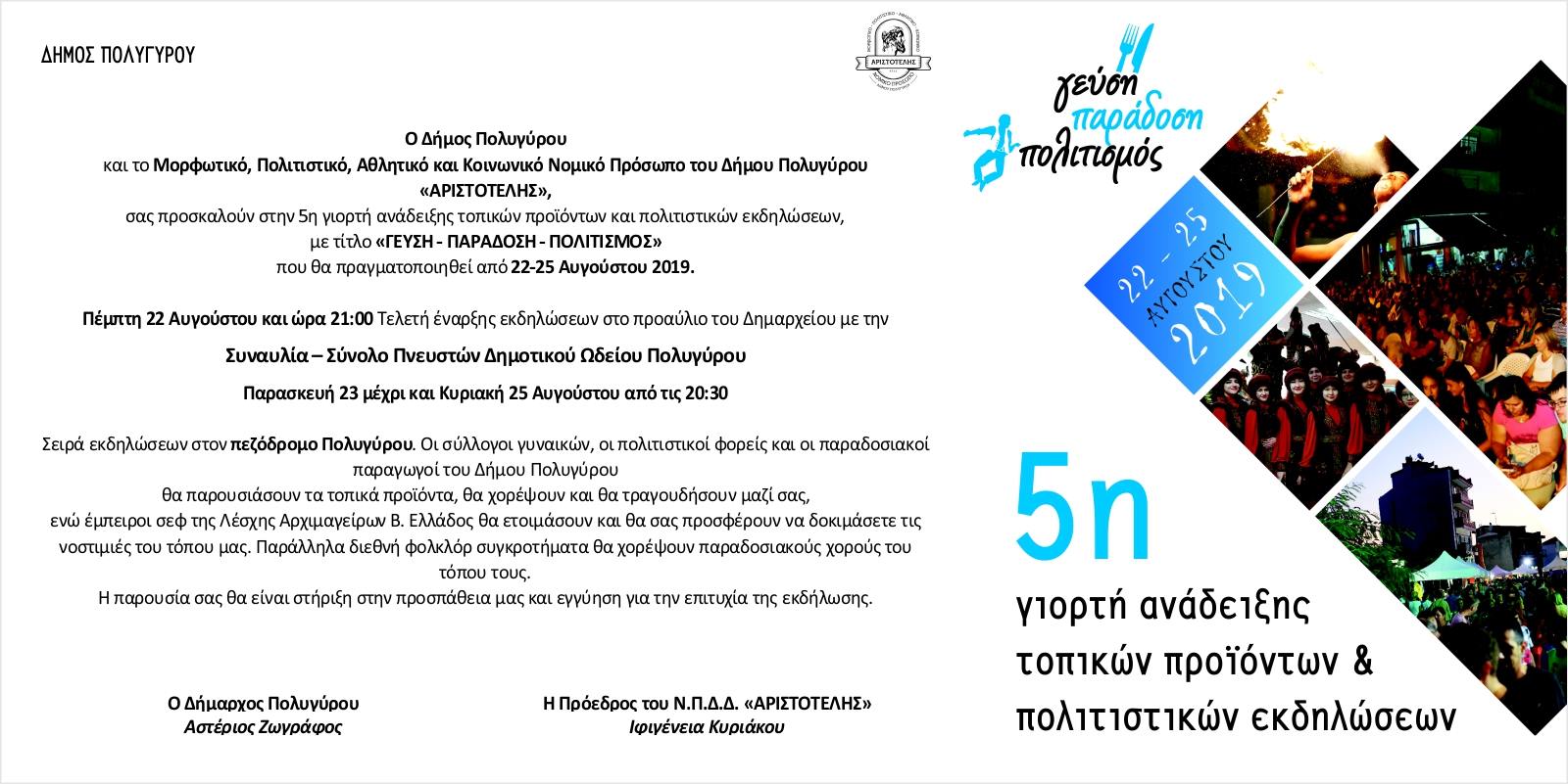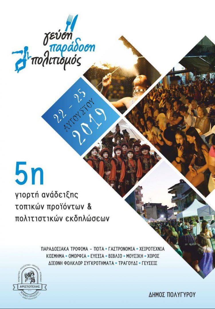 Ένα τετραήμερο γεμάτο από Χαλκιδική, χορούς, γεύσεις και τοπικά προϊόντα θα απολαύσουν οι κάτοικοι και οι επισκέπτες του Πολυγύρου από τις 22 έως τις 25 Αυγούστου 2019, στον πεζόδρομο, στο κέντρο της πόλης.