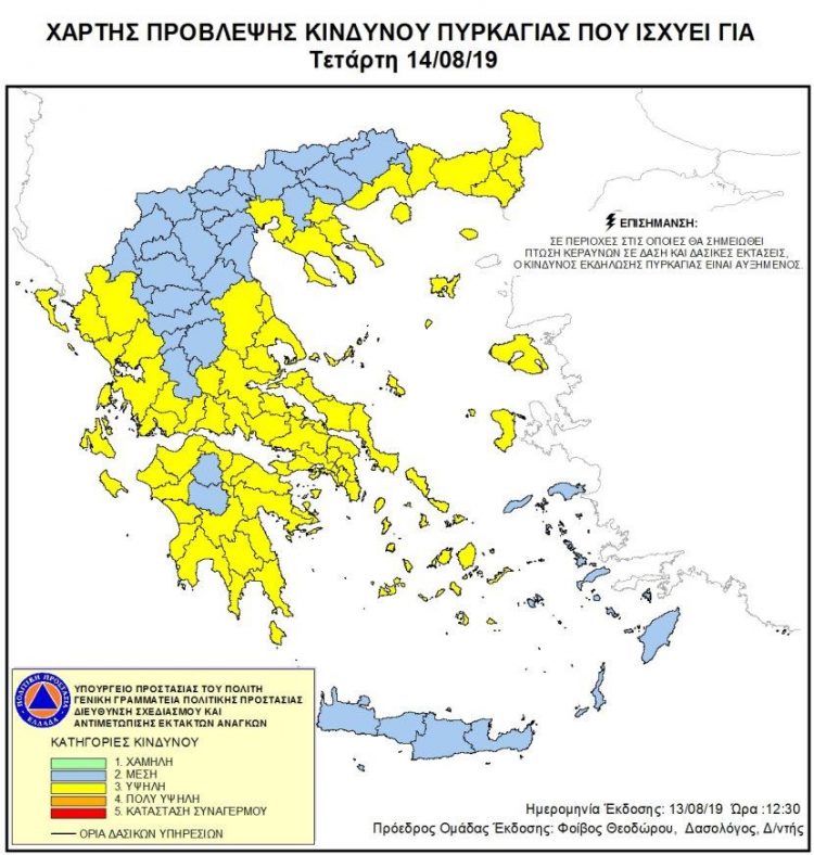 Η Γενική Γραμματεία Πολιτικής Προστασίας του Υπουργείου Προστασίας Του Πολίτη – ΔΙ.Π.Υ. Νομού Χαλκιδικής, ενημερώνει πως σύμφωνα με τον από 14/08/2019 Ημερήσιο Χάρτη Πρόβλεψης Κινδύνου Πυρκαγιάς, για σήμερα ΤΕΤΑΡΤΗ 14-08-2019, προβλέπεται ΥΨΗΛΟΣ κίνδυνος πυρκαγιάς (κατηγορία κινδύνου 3) (Π.Ε.Χαλκιδικής).