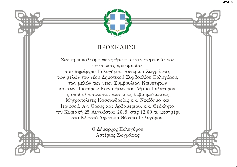 Την Κυριακή 25 Αυγούστου 2019, στις 12:00, θα πραγματοποιηθεί η τελετή ορκωμοσίας των μελών της νέας Δημοτικής Αρχής δήμου Πολυγύρου, στο Δημοτικό Θέατρο Πολυγύρου.