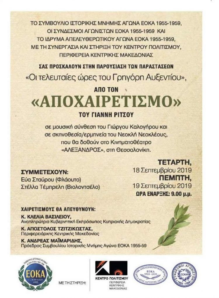 Το Συμβούλιο Ιστορικής Μνήμης Αγώνα ΕΟΚΑ 1955-1959, οι Σύνδεσμοι Αγωνιστών ΕΟΚΑ 1955-1959 και το Ίδρυμα Απελευθερωτικού Αγώνα ΕΟΚΑ 1955-1959, σε συνεργασία με το Κέντρο Πολιτισμού Θεσσαλονίκης, Περιφέρειας Κεντρικής Μακεδονίας, μεταφέρουμε στον κόσμο της Θεσσαλονίκης, τους φοιτητές, την εργαζόμενη νεολαία και τον κόσμο της Βορείου Ελλάδας, ένα από τα συγκλονιστικότερα έργα που αποδίδουν τον Απελευθερωτικό Αγώνα του Κυπριακού Ελληνισμού εναντίον της Βρετανικής αποικιοκρατίας, τις «Τελευταίες ώρες του Γρηγόρη Αυξεντίου» από το ποίημα του μεγάλου μας ποιητή Γιάννη Ρίτσου «ΑΠΟΧΑΙΡΕΤΙΣΜΟΣ».