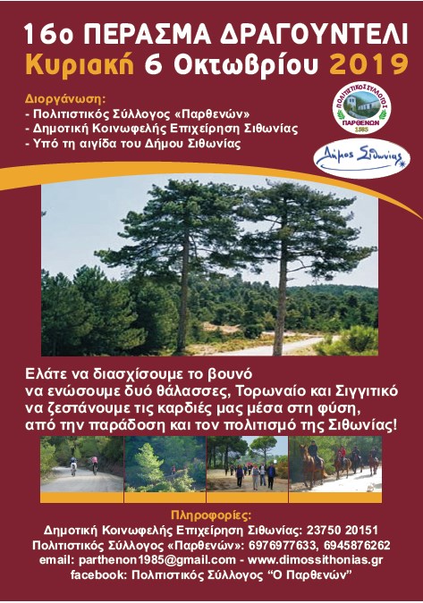 Το 16ο πέρασμα Δραγουντέλι θα διεξαχθεί την Κυριακή 6 Οκτωβρίου 2019. Αυτή η περιβαλλοντική εκδήλωση αποτελεί πλέον θεσμό για τη Σιθωνία και διοργανώνεται από τον Πολιτιστικό Σύλλογο «Παρθενών», τη Δημοτική Κοινωφελή Επιχείρηση Σιθωνίας υπό την αιγίδα του Δήμου Σιθωνίας.