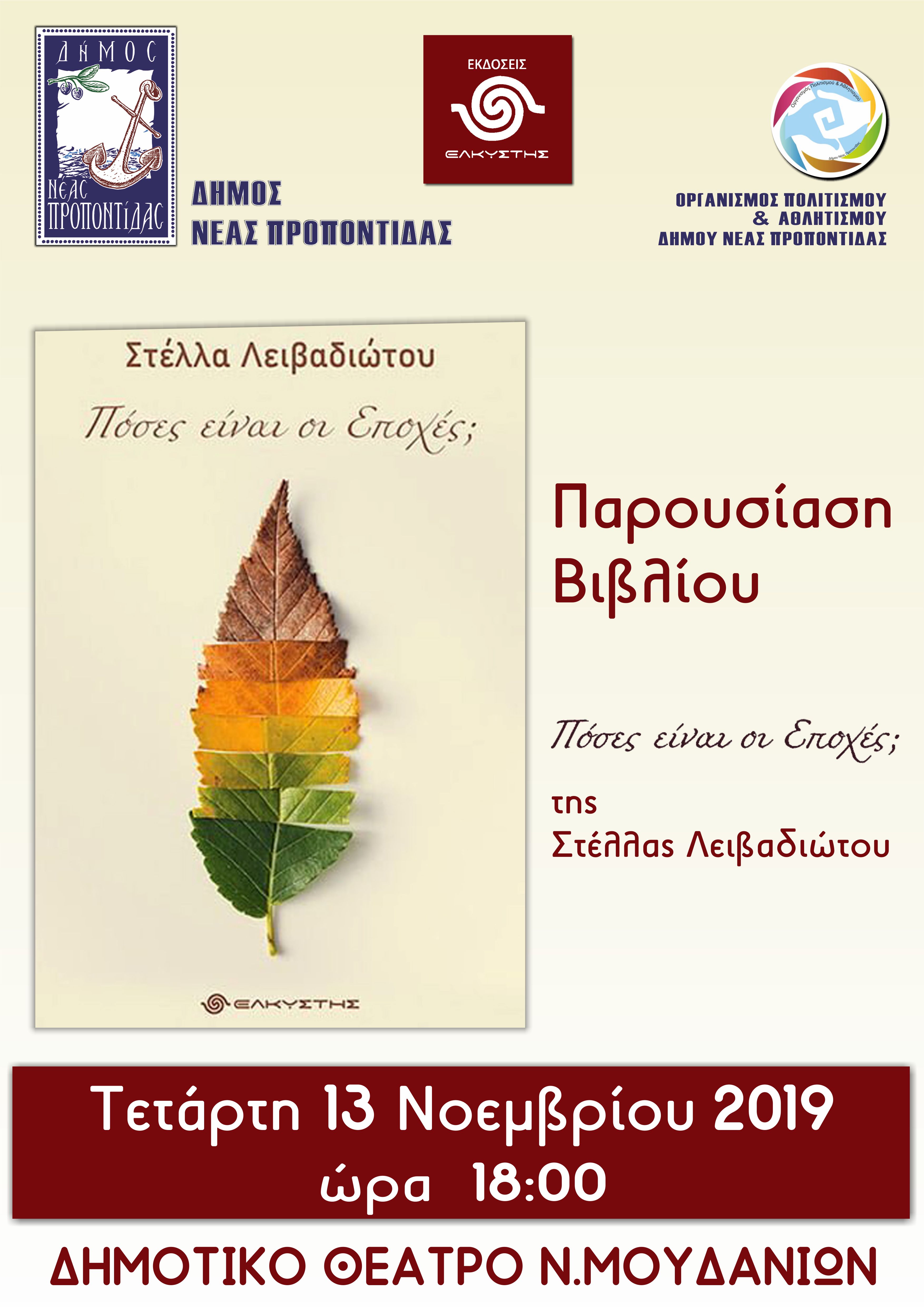 Ο δήμαρχος Ν. Προποντίδας Μ. Καρράς και ο πρόεδρος του Οργανισμού Πολιτισμού και Αθλητισμού του Δήμου Ν. Προποντίδας Π. Σαρόγλου σας προσκαλούν στην παρουσίαση της Συλλογής Διηγημάτων “Πόσες είναι οι εποχές;” της Στέλλας Λειβαδιώτου, των Εκδόσεων “Ελκυστής”, την Τετάρτη 13 Νοεμβρίου 2019 και ώρα 18:00 στο Δημοτικό θέατρο Ν. Μουδανιών.
