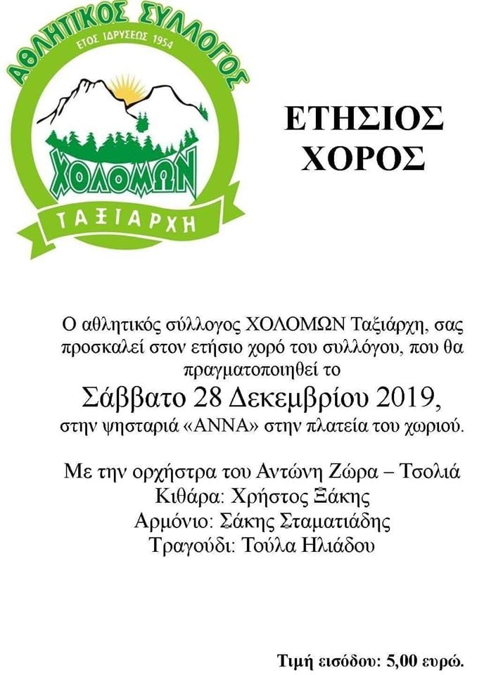 Ετήσιος χορός του Αθλητικού Συλλόγου Χολομών Ταξιάρχη σήμερα Σάββατο 28 Δεκεμβρίου 2019 στην ψησταριά “Αννα” στην πλατεία του χωρίου.