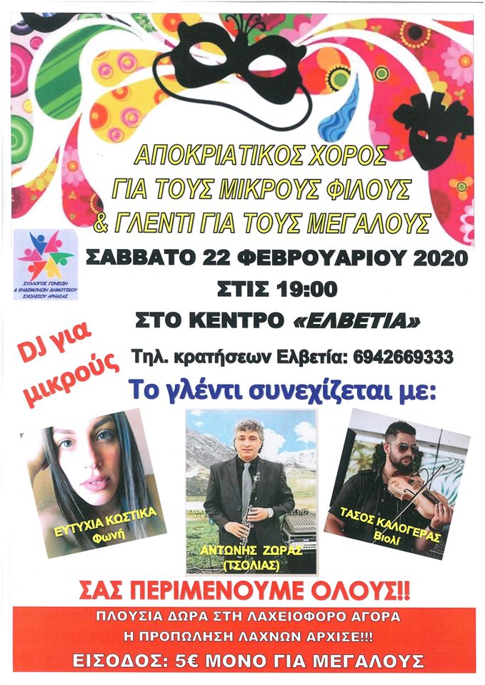 Ο Σύλλογος Γονέων και Κηδεμόνων Δημοτικού Σχολείου Αρναίας διοργανώνει αποκριάτικο χορό στο Κέντρο “ΕΛΒΕΤΊΑ” το Σάββατο 22 Φεβρουάριου 2020 στις 19,00