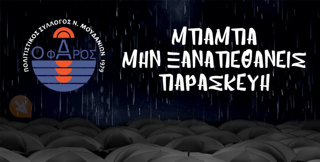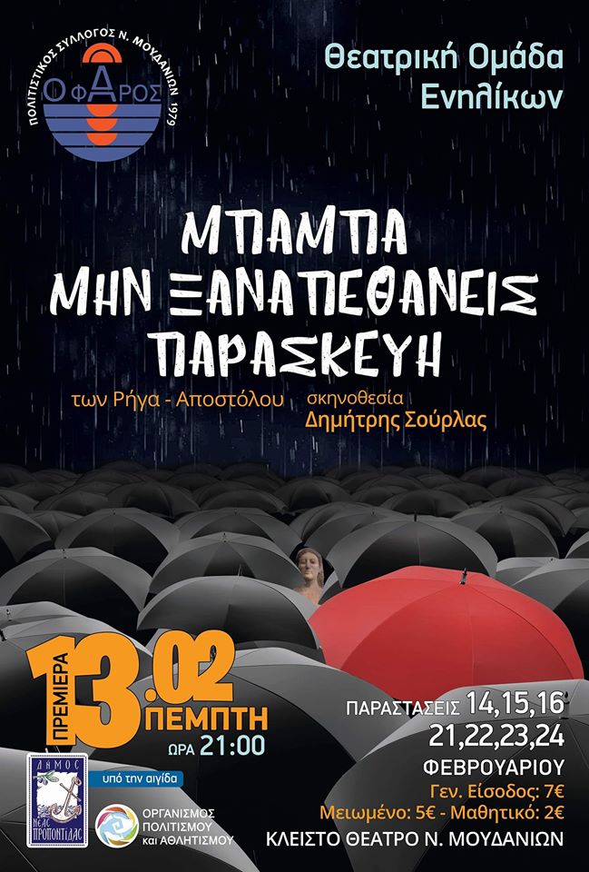 Η μαύρη κωμωδία «Μπαμπά μην Ξαναπεθάνεις Παρασκευή…» των Ρήγα-Αποστόλου, σε σκηνοθεσία Δημήτρη Σούρλα, έρχεται στα Νέα Μουδανιά από την θεατρική ομάδα ενήλικων του Πολιτιστικού Συλλόγου “Ο Φάρος” με την πρεμιέρα στις 13 Φεβρουάριου 2020 και ακόμη 7 παραστάσεις στις 14-15-16-21-22-23-24 στις 21.00 στο Κλειστό Θέατρο Νέων Μουδανιών.