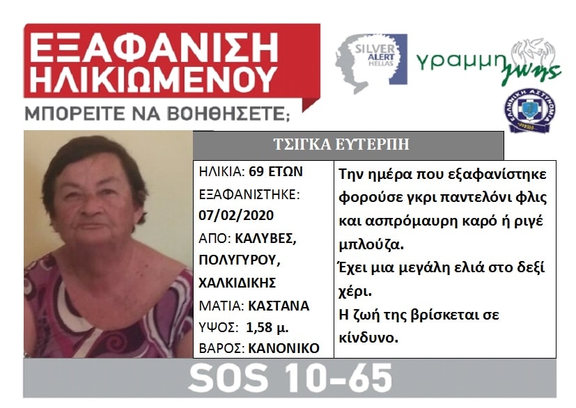«Αγνοείται η μητέρα μου Ευτέρπη (Έφη)Τσίγκα. Σήμερα 7/2 το πρωί έφυγε από το σπίτι στις Καλύβες Χαλκιδικής. Έχει δηλωθεί η εξαφάνιση της. Συγχωριανοί την είδαν να κινείται στο κεντρικό δρόμο του χωριού και προς την παραλία Καλυβών μεταξύ 10 και 11 το πρωί. Αν τυχόν κάποιος/κάποια έχει δει τη μητέρα μου να επικοινωνήσει με την αστυνομία και με μένα.», αναφέρει στην δήλωση εξαφάνισης ο γιος της χθες το βράδυ.