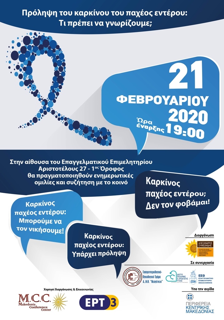 Η Περιφέρεια Κεντρικής Μακεδονίας μέσω του Δικτύου Πρόληψης και Προαγωγής Υγείας και η Γαστρεντερολογική Κλινική του Αντικαρκινικού Νοσοκομείου Θεσσαλονίκης «Θεαγένειο» συνδιοργανώνουν ενημερωτική ημερίδα με θέμα: «Η πρόληψη του καρκίνου παχέως εντέρου – τι πρέπει να γνωρίζουμε;», σε συνεργασία με το Σύλλογο Φίλων του Αντικαρκινικού Νοσοκομείου Θεσσαλονίκης Θεαγένειο «Αλέξανδρος Συμεωνίδης». Η εκδήλωση θα πραγματοποιηθεί την Παρασκευή 21 Φεβρουαρίου 2020, στις 19.00, στην αίθουσα του Επαγγελματικού Επιμελητηρίου Θεσσαλονίκης (Αριστοτέλους 27, 1ος οροφος) και τελεί υπό την αιγίδα της Περιφέρειας Κεντρικής Μακεδονίας.