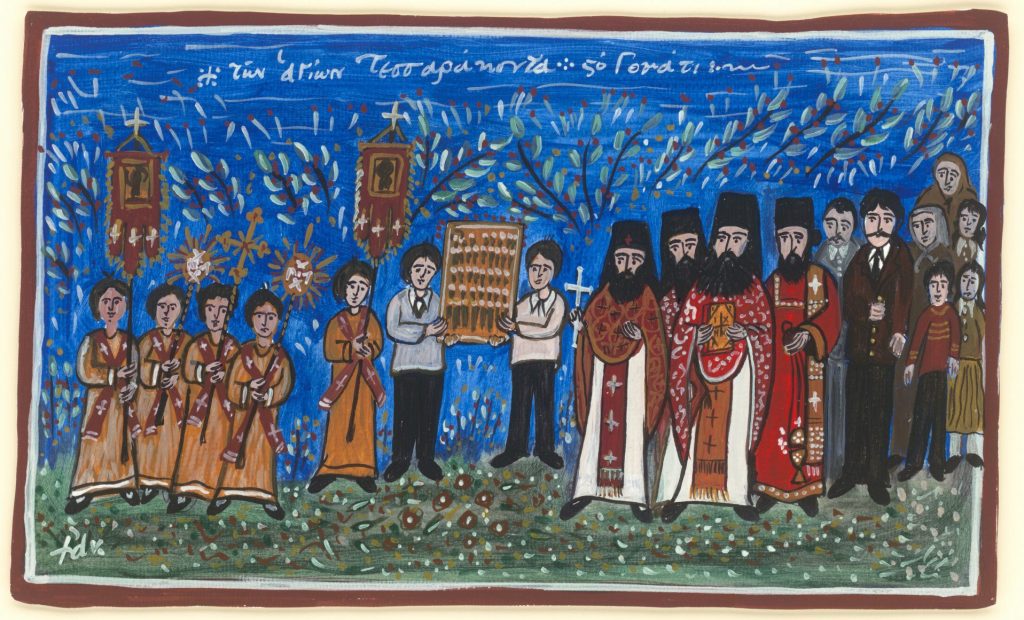 Μιά ἑβδόμαδα πρίν, κάποιες γυναῖκες μαζεύουν ἀπό τό χωριό τά ὑλικά καί τά συγκεντρώνουν στό κτίριο τῆς Πρόνοιας, πλάι ἀπό τό Ναό, καί τήν παραμονή ἑτοιμάζουν τό «κουρμπάνι» γιά τήν αὐριανή τράπεζα. Ἔχει καί ἡ Μεγάλη Σαρακοστή τήν ἀνάπαυλα καί τή χαρά της, τήν ἑορτή τῶν Ἁγίων,Φέτος «Τεσσαράκοντα γάρ ὄντες τήν τεσσαρακονθήμερον ἁγιάζεται», λέγει ὁ ψαλμωδός καί τοῦτο τό λέγομεν διότι, ὡς ἐπί τό πλεῖστον, ἡ γιορτή τῶν Ἁγίων τυχαίνει μέσα στή Μεγάλη Σαρακοστή.