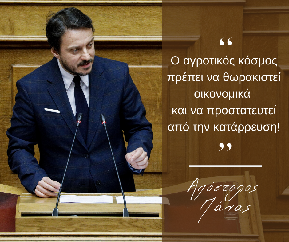Σε συνέχεια της από 20-3-2020 Ανακοίνωσής του με τις 10 προτάσεις-μέτρα άμεσης ενίσχυσης του αγροτικού κόσμου, ενόψει της πανδημίας του κορονοϊού, ο Απόστολος Πάνας, Βουλευτής Χαλκιδικής του Κινήματος Αλλαγής και Υπεύθυνος Κοινοβουλευτικού Τομέα Αγροτικής Ανάπτυξης, κατέθεσε ως επικεφαλής, μαζί με 17 ακόμα Βουλευτές του Κινήματος Αλλαγής, σχετική Ερώτηση προς τους Υπουργούς Αγροτικής Ανάπτυξης & Τροφίμων και Οικονομικών.