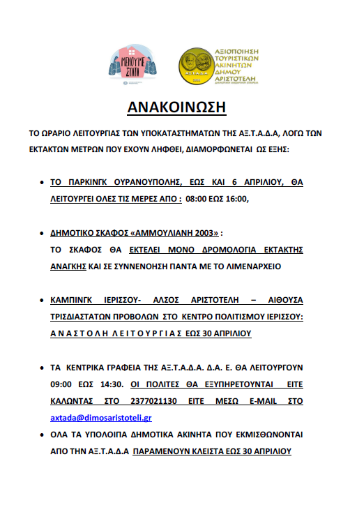 • Τα κεντρικά γραφεία της ΑΞ.Τ.Α.Δ.Α. ε. θα λειτουργούν 09:00 έως 14:30. Οι πολίτες θα εξυπηρετούνται είτε καλώντας στο 2377021130 είτε μεσώ e-mail στο axtada@dimosaristoteli.gr