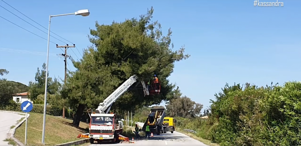 Η κοπή επικίνδυνων δέντρων συνεχίζεται επίσης και στο επαρχιακό οδικό δίκτυο από Πευκοχώρι προς Παλιούρι, για να διευκολυνθεί έτσι και η διέλευση των οχημάτων καθώς οι συνθήκες στο δρόμο ήταν κατά τόπους επικίνδυνες.