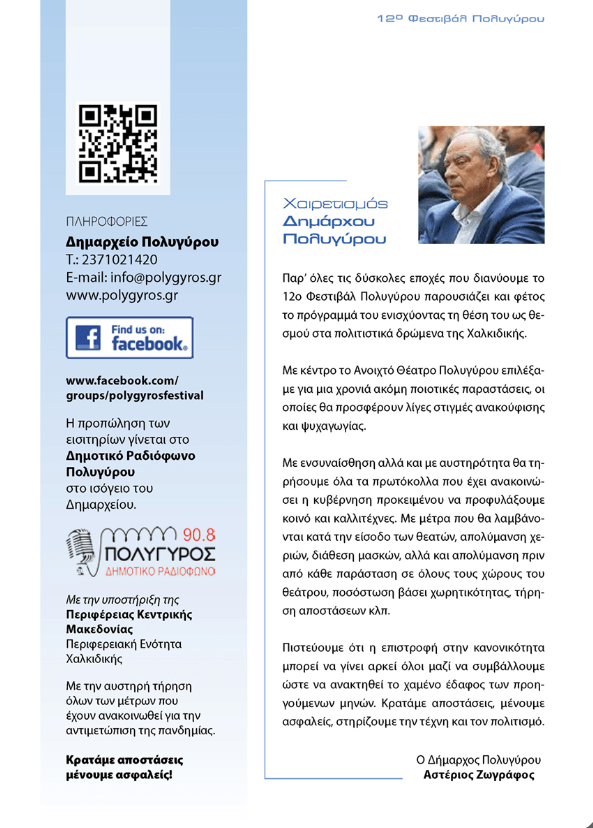 Σημειώνεται ότι σε όλες τις παραστάσεις θα τηρηθούν αυστηρά όλα τα προβλεπόμενα μέτρα που συστήνει το Υπουργείο Υγείας.