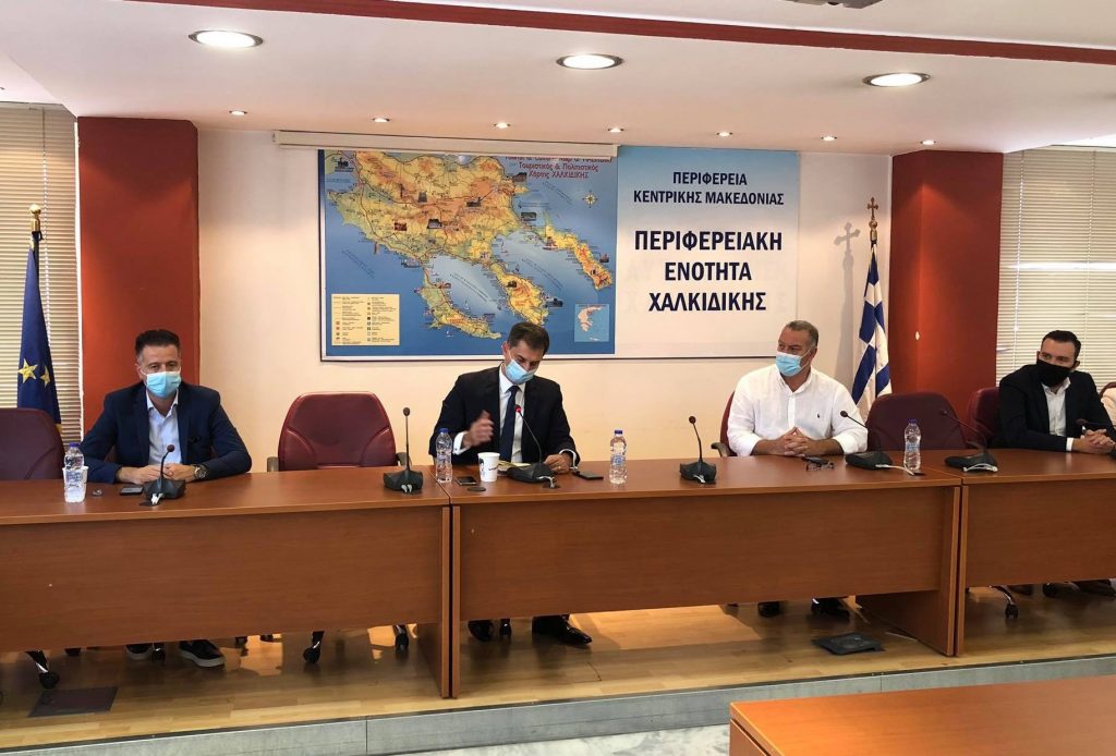 Σύσκεψη πραγματοποιήθηκε την Δευτέρα, 14 Σεπτεμβρίου, στις 12 το μεσημέρι, στην αίθουσα συνεδριάσεων του Διοικητηρίου της Περιφερειακής Ενότητας Χαλκιδικής με τον Υπουργό Τουρισμού κ. Χάρη Θεοχάρη, τον Αντιπεριφερειάρχη Χαλκιδικής κ. Ιωάννη Γιώργο, τον Τομεάρχη Τουρισμού της Περιφέρειας Κεντρικής Μακεδονίας κ. Αλέξανδρο Θάνο, τους Περιφερειακούς Συμβούλους κ.κ. Αικατερίνη Ζωγράφου και Δημήτριο Τζηρίτη, τους Δημάρχους Χαλκιδικής κ.κ. Στυλιανό Βαλιάνο, Αστέριο Ζωγράφο, Μανώλη Καρρά, Κυπαρίσση Ντέμπλα και Αναστασία Χαλκιά, τον Πρόεδρο του Τουριστικού Οργανισμού Χαλκιδικής κ. Γρηγόρη Τάσιο, τον Πρόεδρο του Επιμελητηρίου κ. Ιωάννη Κουφίδη, τον Πρόεδρο της Ένωσης Camping Χαλκιδικής κ. Αντώνη Δεληδημητρίου, τον Πρόεδρο της Ομοσπονδίας Επιχειρηματιών Τουριστικών Καταλυμάτων κ. Τριαντάφυλλο Παπαϊωάννου, στελέχη τουριστικών φορέων και αντιδημάρχων τουρισμού.