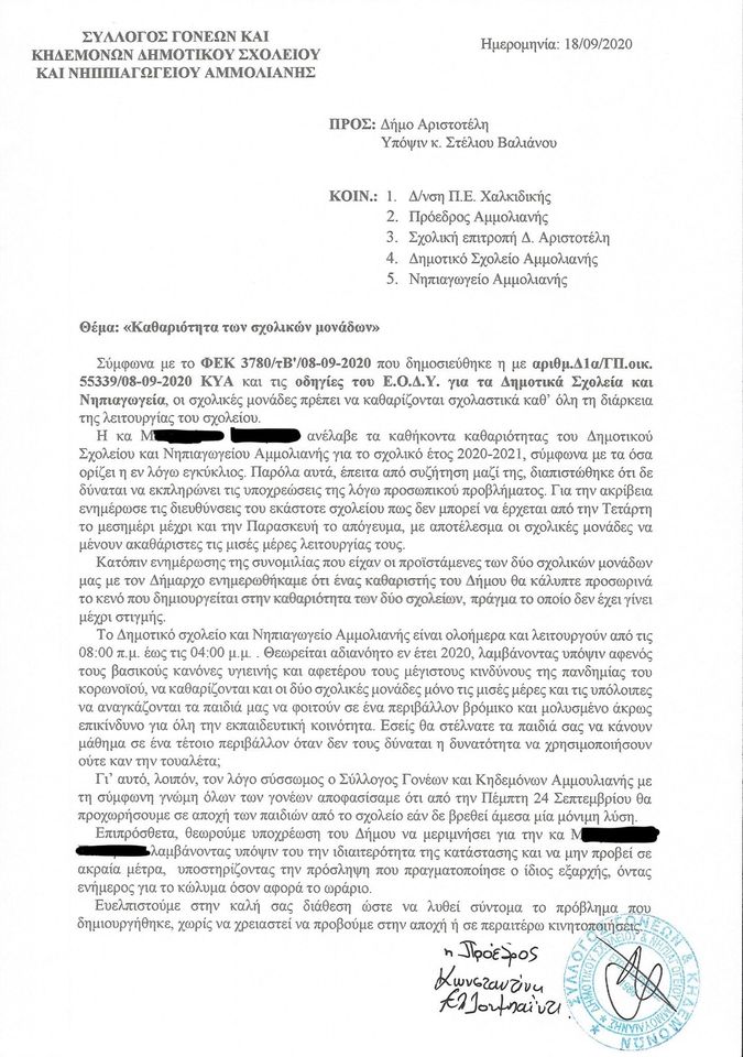 Αναλυτικά, με επιστολή προς τον δήμαρχο Αριστοτέλη Στ. Βαλιάνο, ο Σύλλογος γονέων και κηδεμόνων Δημοτικού σχολείου και νηπ. Αμμουλιανής, επισημαίνει ότι η καθαρίστρια των 2 σχολικών μονάδων, για προσωπικούς λόγους δεν μπορεί να εκπληρώσει τις υποχρεώσεις της, με αποτέλεσμα τα σχολεία να μείνουν ακαθάριστα τις μισές μέρες της λειτουργίας τους εν μέσω πανδημίας του κορωνοϊού.