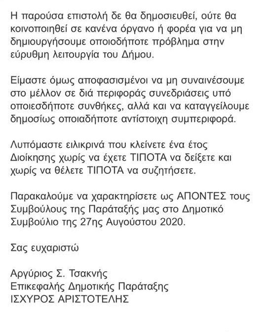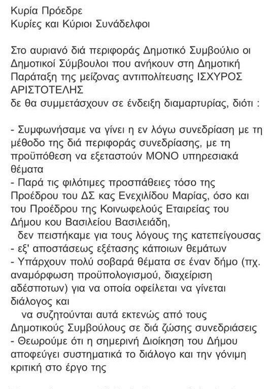 Η παράταξη “Ισχυρός Αριστοτέλης” είχε προειδοποιήσει γραπτώς πριν έναν μήνα την Πρόεδρο και τα μέλη του Δημοτικού Συμβουλίου ότι ήταν αποφασισμένη να μη συναινέσει στο μέλλον σε “διά περιφοράς” συνεδριάσεις και να καταγγείλει δημοσίως τις επαναλαμβανόμενες μεθοδεύσεις για αποφυγή πραγματικών συνεδριάσεων είτε διά ζώσης ή με τηλεδιάσκεψη.
