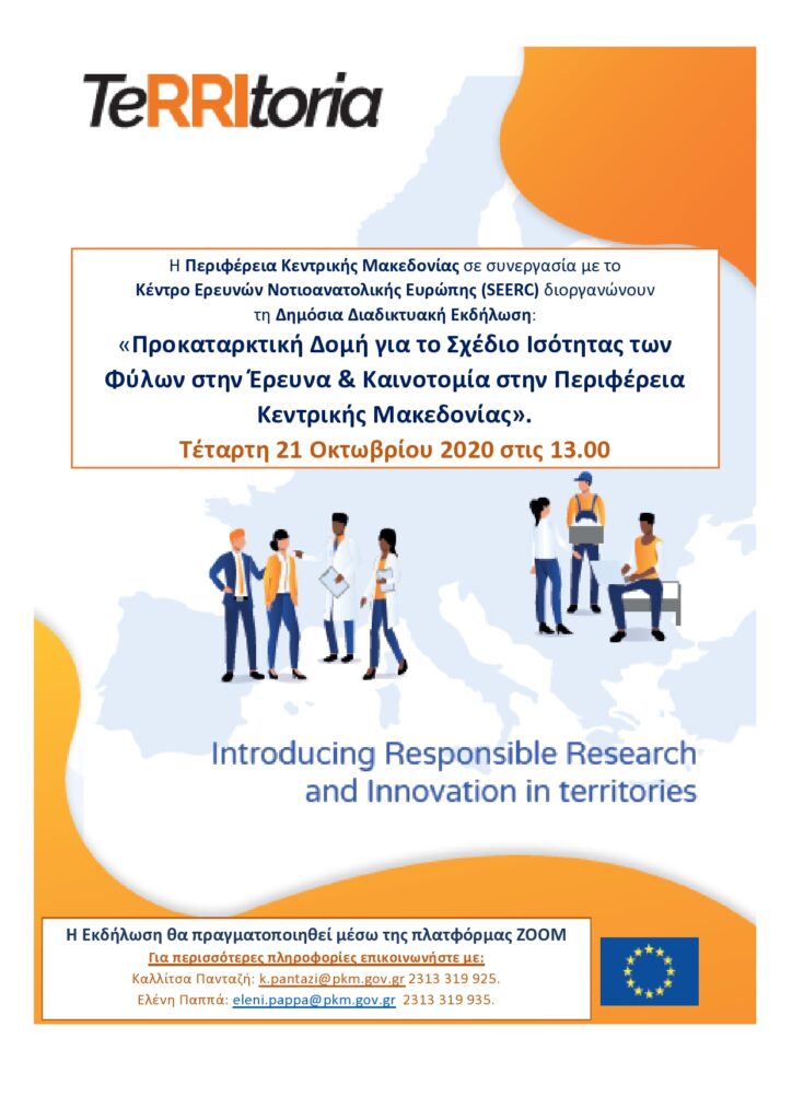 Δημόσια (διαδικτυακή) εκδήλωση με θέμα «Προκαταρκτική Δομή για το Σχέδιο Ισότητας των Φύλων στην Έρευνα & Καινοτομία στην Περιφέρεια Κεντρικής Μακεδονίας» διοργανώνουν η Περιφέρεια Κεντρικής Μακεδονίας σε συνεργασία με το Κέντρο Ερευνών Νοτιοανατολικής Ευρώπης (SEERC) την Τετάρτη 21 Οκτωβρίου 2020 στις 13.00.