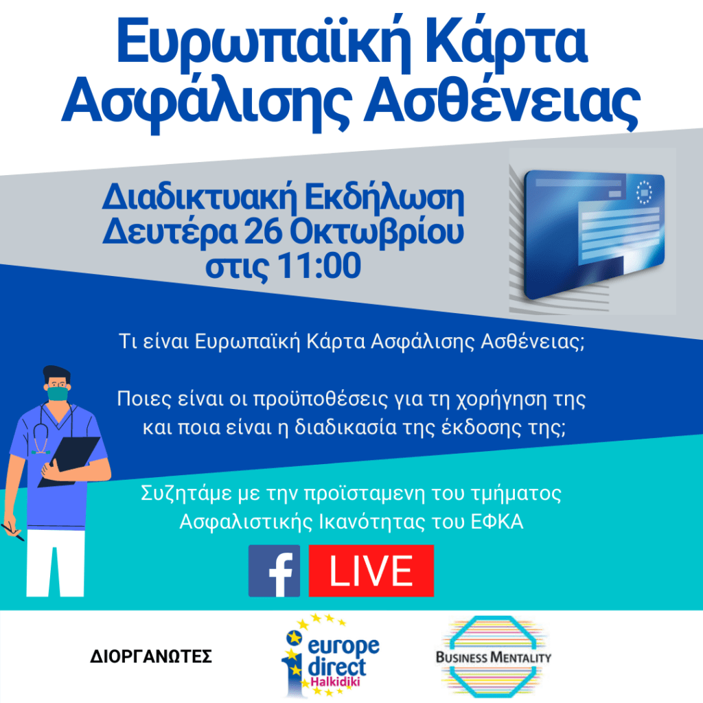 Το Κέντρο Ευρωπαϊκής Πληροφόρησης Europe Direct Halkidiki και ο οργανισμός BUSINESS MENTALITY διοργανώνουν μια διαδικτυακή εκδήλωση την Δευτέρα 26 Οκτώβριου στις 11:00, με θέμα την Ευρωπαϊκή Κάρτα Ασφάλισης Ασθένειας.