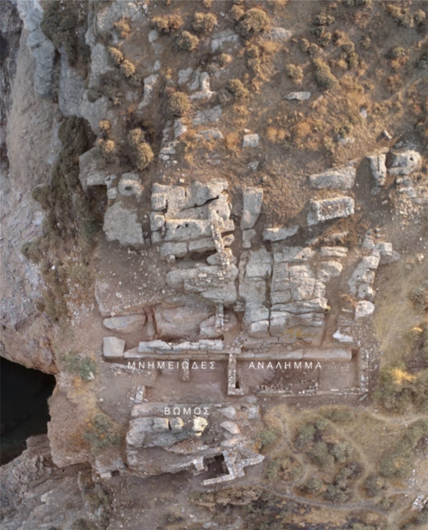 Στο αρχαίο ιερό (εικ. 3-4) που εντοπίστηκε το 2019, οι έρευνες περιορίστηκαν στην ανασκαφή αδιατάρακτων στρωμάτων με σκοπό, αφενός τη χρονολόγηση της κατασκευής του μνημειώδους αναλήμματος και αφετέρου την καλύτερη κατανόηση της φύσης της λατρείας. Όπως και στην περσινή έρευνα συλλέχθηκε εξαιρετικής ποιότητας κεραμεική των γεωμετρικών και αρχαϊκών χρόνων (εικ. 5). Τα σχήματα είναι κυρίως μικρά κλειστά, όπως υδρίες, οινοχόες και πρόχοι, ενώ δεν λείπουν τα μικρογραφικά. Στα ευρήματα συγκαταλέγονται λίγα πήλινα ειδώλια, κυρίως γυναικείων μορφών και ορισμένα χάλκινα αναθήματα, όπως μικρογραφικές πόρπες και άλλα κοσμήματα (εικ. 6). Τα ευρήματα αυτά παραπέμπουν μάλλον σε κάποια γυναικεία θεότητα. Επιπλέον οδηγούν στο συμπέρασμα ότι το ανάλημμα κτίστηκε κατά τους κλασικούς χρόνους προκειμένου να δημιουργηθεί άνδηρο για την κατασκευή ναού, από τον οποίο σώζονται μόνον κάποια λαξεύματα στο ριζιμιό βράχο καθώς στην περιοχή αναπτύχθηκε ο πρωτοβυζαντινός οικισμός (στην τελευταία φάση χρήσης του χώρου ανήκει ακέραιος λύχνος, εικ. 7). Στα Ανατολικά υπήρχε μνημειώδης βωμός λαξευμένος στο φυσικό βράχο, σήμερα πολύ διαβρωμένος.