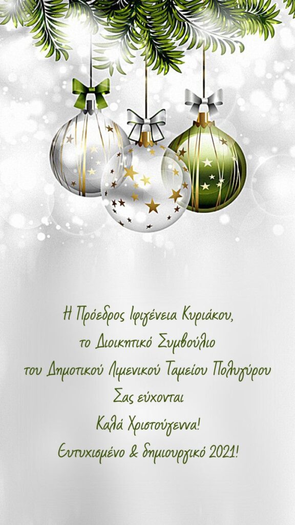 Καλά Χριστούγεννα και Ευτυχισμένο το νέο Έτος σας εύχονται η πρόεδρος και το Δ.Σ. του Δημοτικού Λιμενικού Ταμείου Πολυγύρου.