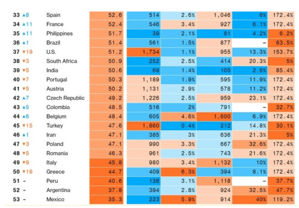 Ανάμεσα στις χειρότερες χώρες στον κόσμο για να ζει κανείς εν μέσω πανδημίας είναι η Ελλάδα, σύμφωνα με το δημοφιλές οικονομικό σάιτ Bloomberg. Συγκεκριμένα, το σάιτ ξεχώρισε 53 χώρες και τις κατέταξε με βάση τα κρούσματα, τους θανάτους, τη διάρκεια της καραντίνας, την ελευθερία στη μετακίνηση, την ανταπόκριση του συστήματος υγείας και τις εκτιμήσεις για το μέλλον της οικονομίας. Περού, Αργεντινή και Μεξικό είναι οι μόνες χώρες με χειρότερα αποτελέσματα από την Ελλάδα ωστόσο κρατάμε μια επιφύλαξη για τα στοιχεία γιατί υπάρχουν δημοσιεύματα που ισχυρίζονται πως το Bloomberg δεν υπάρχει και οι δημοσιογράφοι του είναι στην πραγματικότητα ηθοποιοί.
