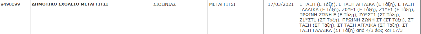 - το Δημοτικό Σχολείο Μεταγγίτσι αναστέλλουν τη λειτουργία τους τα τμήματα Ε ΤΑΞΗ (Ε Τάξη), Ε ΤΑΞΗ ΑΓΓΛΙΚΑ (Ε Τάξη), Ε ΤΑΞΗ ΓΑΛΛΙΚΑ (Ε Τάξη), Ζ0*Ε1 (Ε Τάξη), Ζ1*Ε1 (Ε Τάξη), ΠΡΩΙΝΗ ΖΩΝΗ Ε (Ε Τάξη), Ζ0*ΣΤ1 (ΣΤ Τάξη), Ζ1*ΣΤ1 (ΣΤ Τάξη), ΠΡΩΙΝΗ ΖΩΝΗ ΣΤ (ΣΤ Τάξη), ΣΤ ΤΑΞΗ (ΣΤ Τάξη), ΣΤ ΤΑΞΗ ΑΓΓΛΙΚΑ (ΣΤ Τάξη), ΣΤ ΤΑΞΗ ΓΑΛΛΙΚΑ (ΣΤ Τάξη) από 4/3 έως και 17/3