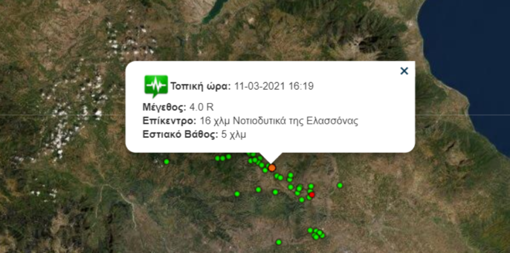 Ο σεισμός είχε επίκεντρο περιοχή 16 χιλιόμετρα νοτιοδυτικά της Ελασσόνας, ενώ το εστιακό βάθος της σεισμικής δόνησης ήταν στα 5,8 χιλιόμετρα.