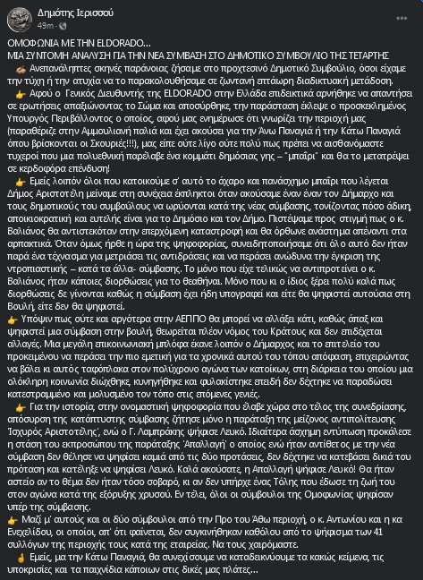 Απόψεις ανθρώπων της περιοχής που αρθρογραφούν στον «Δημότη Ιερισσού» μια σελίδα στο Facebook που προασπίζει τα συμφέροντα της ευρύτερης περιοχής της Ιερισσού για την ομοφωνία με την Eldorado, μια σύντομη ανάλυση για τη νέα σύμβαση στο δημοτικό συμβούλιο της Τετάρτης του δήμου Αριστοτέλη.
