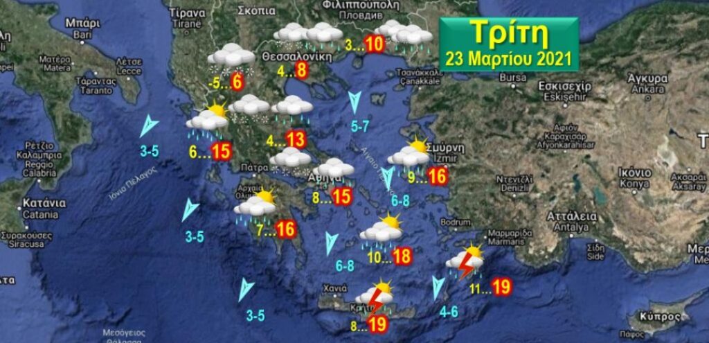 Στη βορειοδυτική Ελλάδα με ηλιοφάνεια και παροδική συννεφιά. Στην υπόλοιπη χώρα τοπικές βροχές, στην Κρήτη και τα Δωδεκάνησα λίγες καταιγίδες, χιόνια στα ορεινά και σε ημιορεινά της κεντρικής και βόρειας Ελλάδας και πιθανόν και σε πεδινά της βόρειας Ελλάδας. Οι άνεμοι Βοριάδες, στα πελάγη 5-7 Μποφόρ. Η θερμοκρασία σε χαμηλά επίπεδα με παγετό τη νύχτα και το πρωί, ισχυρό στη βόρεια Ελλάδα.