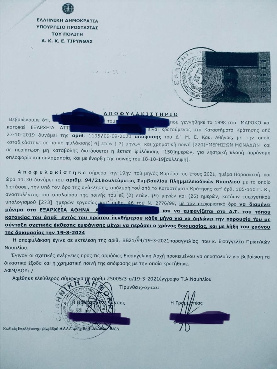Έκπληκτοι οι αστυνομικοί της ομάδας ΔΡΑΣΗ και της Ασφάλειας Εξαρχείων, διαπίστωσαν ότι ο ένας συλληφθείς, ο 22χρονος Μαροκινός την προηγούμενη είχε αποφυλακιστεί από το σωφρονιστικό κατάστημα Τίρυνθας όπου οδηγήθηκε στις 23.10.2019 καθώς καταδικάστηκε σε ποινή 4 ετών και 7 μηνών για ληστρική κλοπή, παράνομη οπλοφορία και οπλοχρησία.