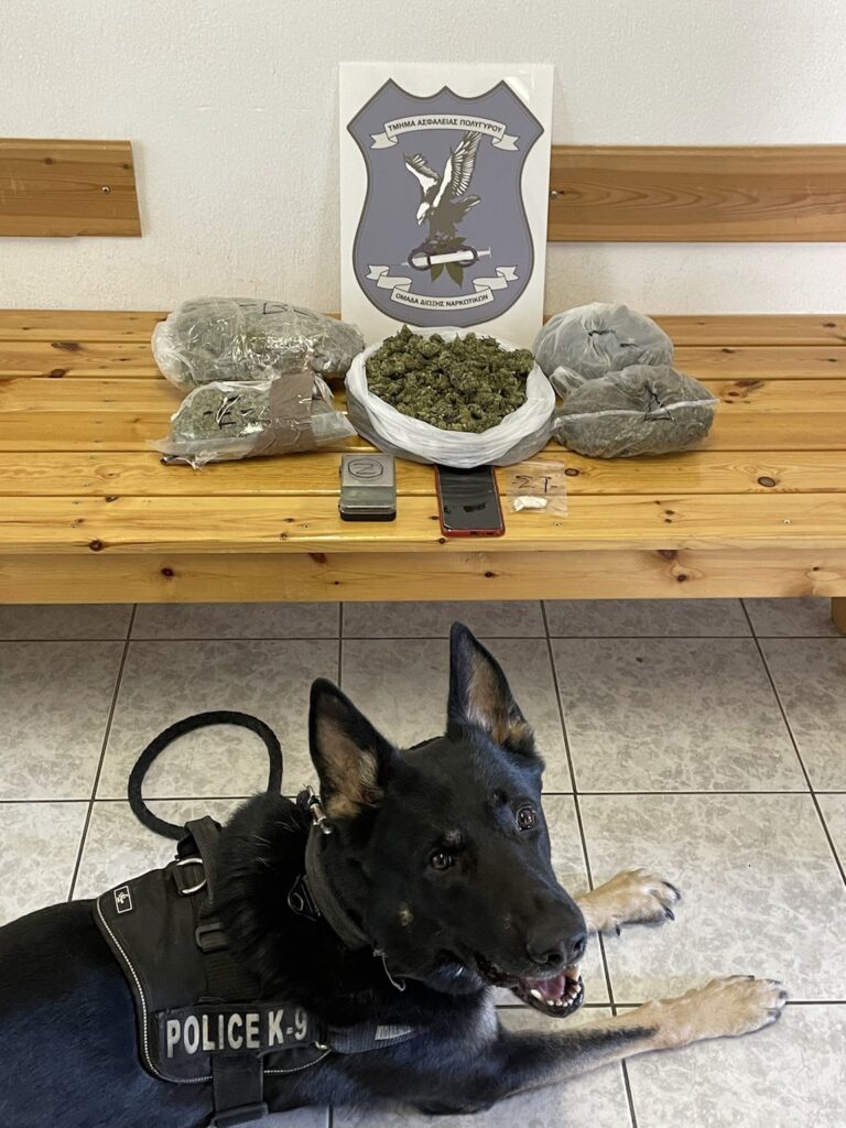 Στις έρευνες συμμετείχε και ο αστυνομικός σκύλος ανίχνευσης ναρκωτικών ουσιών «Ακύλας», της Διεύθυνσης Αστυνομίας Χαλκιδικής.