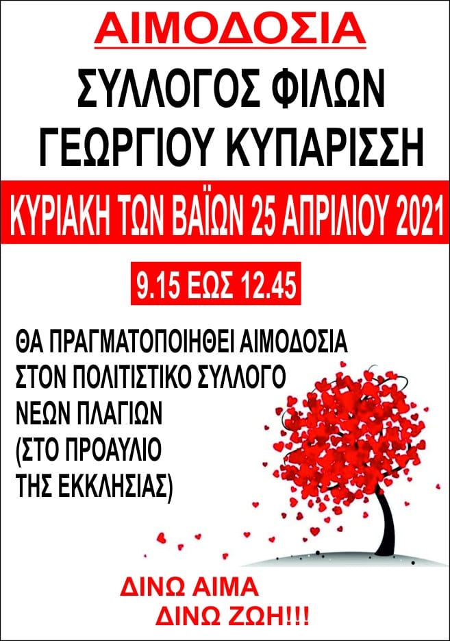 Ο Σύλλογος Φίλων “Γεωργίου Κυπαρίσσι” διοργανώνει αιμοδοσία την Κυριακή των Βαΐων 25 Απριλίου 2021 στα Νέα Πλάγια (στο προαύλιο της εκκλησίας) από τις 09.15 έως 12.45.