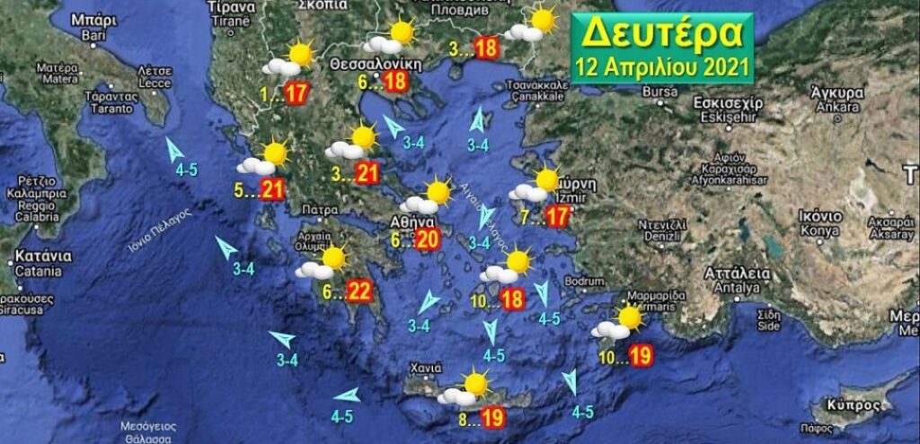Άνεμοι, μεταβλητών διευθύνσεων 3-5 Μποφόρ, στο νοτιοανατολικό Αιγαίο Βοριάδες 4-6 Μποφόρ. Θερμοκρασίες, στη βόρεια και κεντρική χώρα από 1 έως 21, στο Ιόνιο, τη δυτική και νότια χώρα από 5 έως 22, στο βόρειο και ανατολικό Αιγαίο από 7 έως 17, στις Κυκλάδες, την Κρήτη και τα Δωδεκάνησα από 8 έως 19 βαθμούς.
