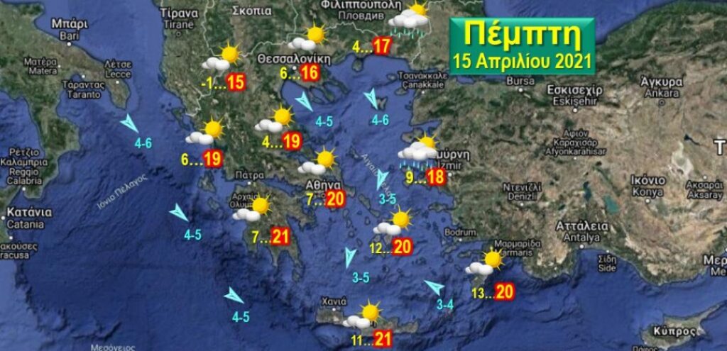 Άνεμοι, Βοριάδες, στα πελάγη 4-6 Μποφόρ με εξασθένιση, στα Δωδεκάνησα Νοτιάδες 3-4 Μποφόρ. Θερμοκρασίες, στη βόρεια χώρα από -1 έως 17, στο Ιόνιο, τη δυτική, κεντρική και νότια χώρα από 4 έως 21, στο βόρειο και ανατολικό Αιγαίο από 9 έως 18, στις Κυκλάδες, την Κρήτη και τα Δωδεκάνησα από 11 έως 21 βαθμούς.