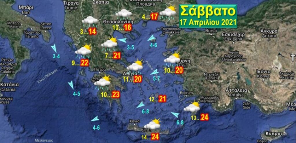 Άνεμοι, Ανατολικοί 3-5 Μποφόρ, στα νότια πελάγη 6-8 Μποφόρ, στο Ιόνιο Βοριάδες 4-6 Μποφόρ. Θερμοκρασίες, στη βόρεια χώρα από 3 έως 17, στο Ιόνιο, τη δυτική, κεντρική και νότια χώρα από 7 έως 23, στο βόρειο και ανατολικό Αιγαίο από 9 έως 20, στις Κυκλάδες, την Κρήτη και τα Δωδεκάνησα από 13 έως 25 βαθμούς.
