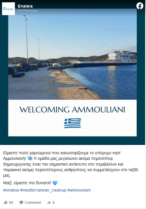 Συγκεκριμένα, ο Αναπτυξιακός Σύλλογος Αμμουλιανής σε συνεργασία με τους ψαράδες του νησιού συμμετέχει στο πρόγραμμα Εnaleia. Οι καπετάνιοι και τα πληρώματά τους θα καθαρίζουν τις θάλασσές ψαρεύοντας πλαστικά. Η Εnaleia θέλει να υποστηρίξει τους ψαράδες να ψαρεύουν καλύτερα, καθαρίζοντας ταυτόχρονα τη θάλασσα από το πλαστικό.