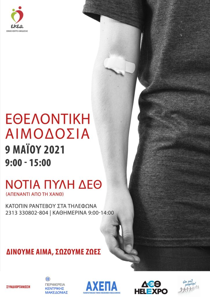Τα νοσοκομεία της Θεσσαλονίκης και της Βόρειας Ελλάδας συνεχίζουν να έχουν μεγάλη ανάγκη για αίμα, ιδιαίτερα αυτές τις Άγιες Μέρες. Το Εθνικό Κέντρο Αιμοδοσίας, η Περιφέρεια Κεντρικής Μακεδονίας μέσω της Αντιπεριφέρειας Υγείας, το Πανεπιστημιακό Γενικό Νοσοκομείο Θεσσαλονίκης «ΑΧΕΠΑ», το «Όλοι μαζί μπορούμε», και η ΔΕΘ HELEXPO A.E. , με πλήρη συναίσθηση της ευθύνης τους για την ασφάλεια του αίματος και των αιμοδοτών, διοργανώνουν τρίτη δράση εθελοντικής αιμοδοσίας την Κυριακή 9 Μαΐου 2021, στις ώρες 09.00-15.00, στη Νότια Πύλη της Δ.Ε.Θ. (απέναντι από τη Χ.Α.Ν.Θ.).