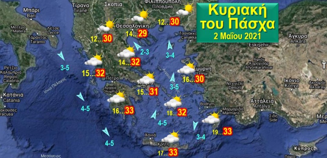 Υψηλές θερμοκρασίες την Κυριακή και τη Δευτέρα του Πάσχα με τις μέγιστες τιμές έως τους 30-35 βαθμούς.