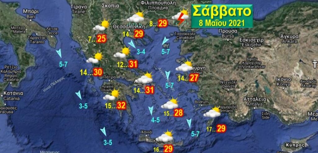 Άνεμοι: Σταδιακά θα ενισχυθούν, στο Ιόνιο Βοριάδες, στο Αιγαίο Βορειοανατολικοί 5-7 Μποφόρ. Θερμοκρασίες: Στη βόρεια χώρα από 5 έως 29, στο Ιόνιο, τη δυτική, κεντρική και νότια χώρα από 12 έως 32, στο βόρειο και ανατολικό Αιγαίο από 14 έως 27, στις Κυκλάδες, την Κρήτη και τα Δωδεκάνησα από 15 έως 29 βαθμούς.