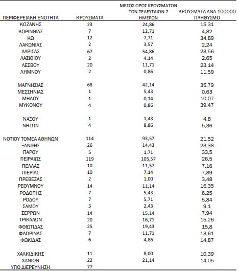 Η διασπορά των νέων κρουσμάτων ανά Περιφερειακή Ενότητα: