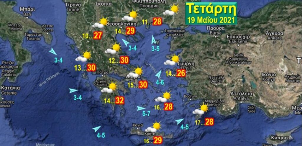 Άνεμοι: Δυτικοί και Νοτιάδες, στα πελάγη 5-7 Μποφόρ. Θερμοκρασίες: Στη βόρεια και δυτική χώρα από 10 έως 30 βαθμούς, στην κεντρική και νότια από 12 έως 32, στο βόρειο και ανατολικό Αιγαίο από 14 έως 26, στις Κυκλάδες, την Κρήτη και τα Δωδεκάνησα από 16 έως 29 βαθμούς.