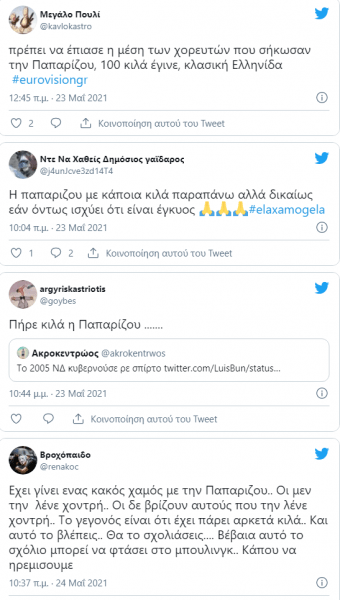 Ωστόσο υπήρχαν κάποιοι που ασχολήθηκαν με τα κιλά της και όχι με το υπερθέαμα που πρόσφερε. Ορισμένοι κάνοντας χαζό χιούμορ ανέφεραν ότι το μακρινό 2005 τη σήκωνε στους ώμους του στη χορογραφία ένας χορευτής ενώ το 2021 χρειάστηκαν δύο χορευτές για να τη σηκώσουν ψηλά. Βεβαίως, οι περισσότεροι απάντησαν στους κακεντρεχείς κάνοντας λόγο για απρεπή σχόλια.