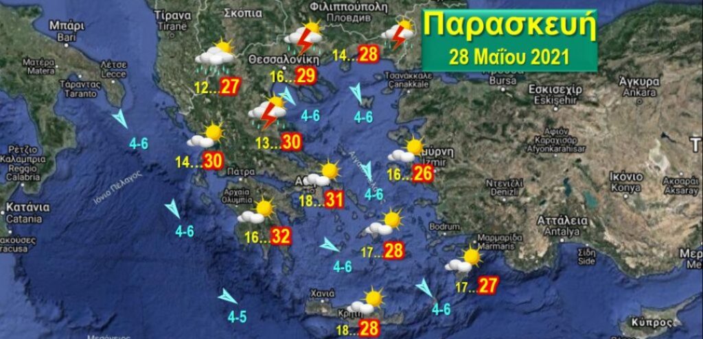 Άνεμοι: Βοριάδες, στα πελάγη 4-6 Μποφόρ. Θερμοκρασίες: Στη βόρεια και δυτική χώρα από 12 έως 30 βαθμούς, στην κεντρική και νότια από 13 έως 32, στο βόρειο και ανατολικό Αιγαίο από 16 έως 26, στις Κυκλάδες, την Κρήτη και τα Δωδεκάνησα από 16 έως 28 βαθμούς.