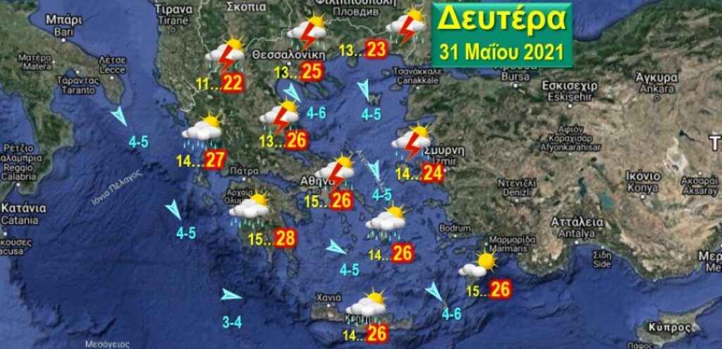 Άνεμοι: Βοριάδες, στα πελάγη 4-6 Μποφόρ. Θερμοκρασίες: Στη βόρεια και κεντρική χώρα από 11 έως 28 βαθμούς, στη δυτική και νότια από 13 έως 28, στο βόρειο και ανατολικό Αιγαίο από 14 έως 24, στις Κυκλάδες, την Κρήτη και τα Δωδεκάνησα από 14 έως 26 βαθμούς.