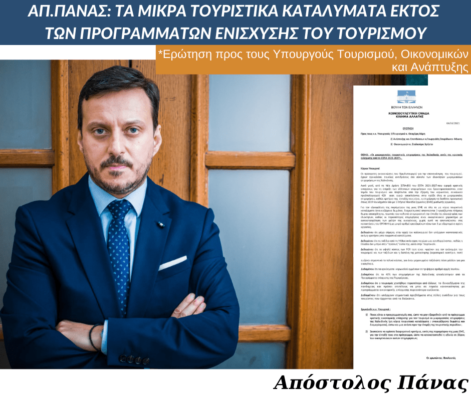 Ερώτηση κατέθεσε ο Γραμματέας της Βουλής και Βουλευτής Χαλκιδικής του Κινήματος Αλλαγής Πάνας Απόστολος προς τους Υπουργούς Τουρισμού, Οικονομικών και Ανάπτυξης , ζητώντας την ένταξη όλων των μικρομεσαίων επιχειρήσεων τουρισμού της Χαλκιδικής στην οικονομική ενίσχυση της Νέας Δράσης (ΕΠΑνΕΚ) του ΕΣΠΑ 2021-2027.