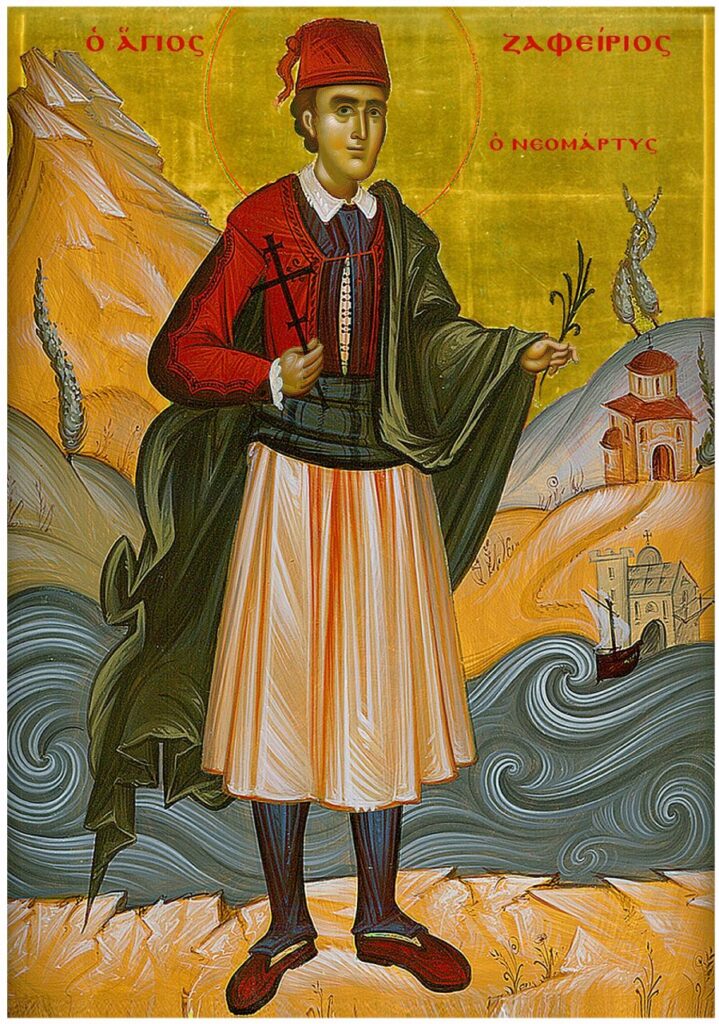 Εν τη πίστεως πέτρα εδρασθείς γενναιότατα, πλάνην εμυκτήρισας Αγαρ, νεομάρτυς Ζαφείριε· νεότητος το άνθος παριδών, τό αίμά σου προσήνεγκας Θεώ· όθεν στέφει εκοσμήθης εν ουρανοίς, ως αθλητής χριστόψυχος. Δόξα τώ σε καλέσαντι Θεώ, δόξα τώ σε δυναμώσαντι, δόξα τώ δεδωκότι σε ημίν, μεσίτην ακαταίσχυντον.
