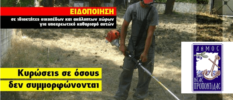 Οι ιδιοκτήτες, νομείς και επικαρπωτές οικοπέδων και λοιπών ακάλυπτων χώρων που βρίσκονται εντός πόλεων, κωμοπόλεων και οικισμών και σε απόσταση μέχρι 100 μ. από τα όριά τους, υποχρεούνται να προβούν στην αποψίλωση αυτών από τα ξερά χόρτα και στην απομάκρυνσή τους, στην απομάκρυνση τυχόν άλλων εγκαταλελειμμένων εύφλεκτων υλικών και αντικειμένων, προς αποτροπή του κινδύνου πρόκλησης πυρκαγιάς ή ταχείας επέκτασής της, καθώς και στη λήψη κάθε άλλου κατά περίπτωση μέτρου που αποβλέπει στην αποφυγή αιτίων και τη μείωση του κινδύνου από πυρκαγιά σύμφωνα με την υπ. αρίθμ. 4/2012 (ΦΕΚ 1346/25-4-2012 Τεύχος ΒΆ) Πυροσβεστική Διάταξη.