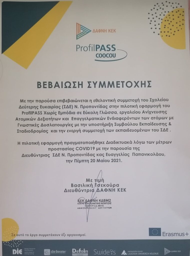 Το ΣΔΕ Ν. Προποντίδας συμμετείχε εθελοντικά με εξ αποστάσεως τρόπο στην πιλοτική εφαρμογή του έργου ERASMUS+ KA204 “COOCOU”, ProfilPass Χωρίς Εμπόδια σε Εύκολη Γλώσσα. Το συγκεκριμένο εργαλείο απευθύνεται σε άτομα που η μητρική τους γλώσσα δεν είναι η Ελληνική και στόχο έχει την δυνατότητα ανίχνευσης των επαγγελματικών ενδιαφερόντων και των ατομικών ικανοτήτων τους.
