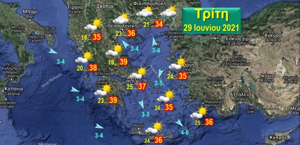Άνεμοι: Μεταβλητοί, στα πελάγη Βοριάδες 4-5 Μποφόρ. Θερμοκρασίες: Στα βόρεια ηπειρωτικά από 16 έως 36, στο Ιόνιο, τα δυτικά, κεντρικά και νότια ηπειρωτικά από 21 έως 39, στα νησιά του βόρειου και ανατολικού Αιγαίου από 22 έως 35, στις Κυκλάδες, την Κρήτη και τα Δωδεκάνησα από 23 έως 37 βαθμούς.