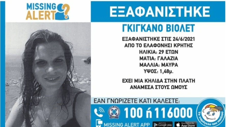 Με τις έρευνες εντοπισμού της να μην έχουν αποδώσει καρπούς εκδόθηκε χτες το απόγευμα από το «Χαμόγελο του παιδιού» Missing Alert. Πρόκειται για τη Βιολέτ Γκιγκανό η οποία έχει ύψος 1.48 μ., μαύρα μαλλιά και γαλάζια μάτια. Η κοπέλα μάλιστα έχει μία χαρακτηριστική κηλίδα στην πλάτη ανάμεσα στους ώμους. Η 29χρονη Γαλλίδα εξαφανίστηκε στις 24 Ιουνίου από το Ελαφονήσι της Κρήτης και έπρεπε να έχει επιστρέψει στην πατρίδα της στις 28 του ίδιου μήνα.