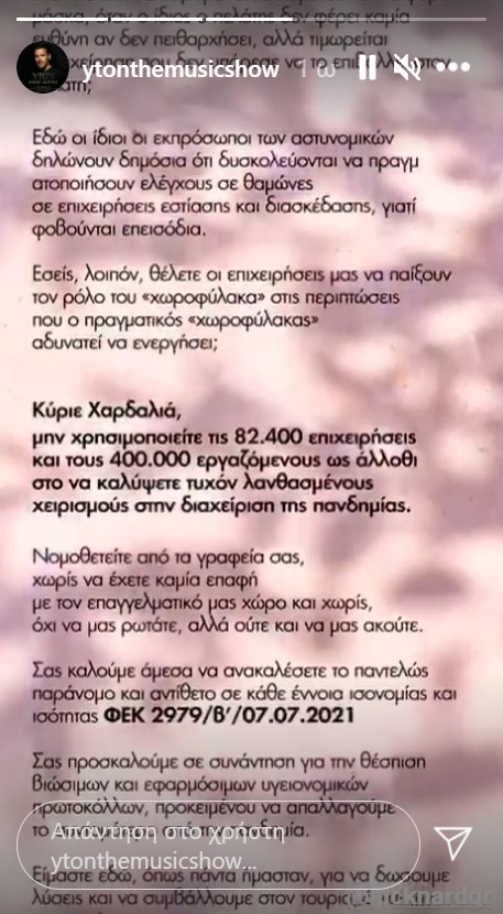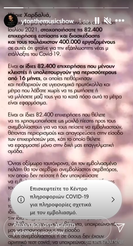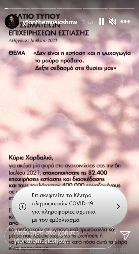 Αξίζει να σημειωθεί πως την συγκεκριμένη ανακοίνωση κοινοποίησε στους λογαριασμούς του στα μέσα κοινωνικής δικτύωσης και το νυχτερινό κέντρο «ΥΤΟΝ the music show» όπου εμφανίζεται ο Νίκος Βέρτης, το οποίο την Τετάρτη (7/7) γνωστοποίησε πως το επερχόμενο τριήμερο δεν θα λειτουργήσει.